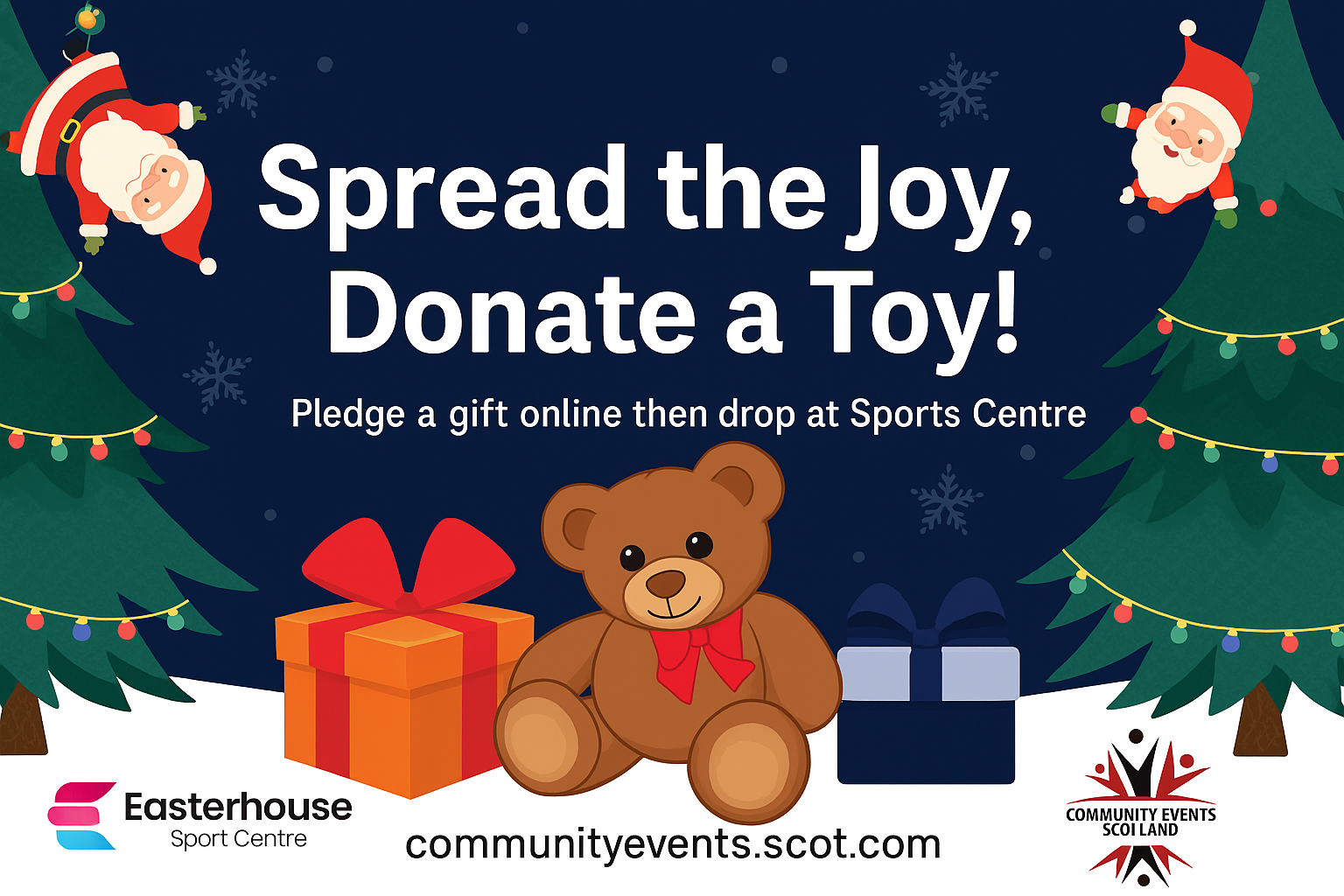 Community Events Scotland and Easterhouse Sports Centre are inviting everyone to join our ‘Spread the Joy toy campaign!’ Help brighten a child’s Christmas by donating a new, unwrapped toy at Easterhouse Sports Centre, or make a secure online donation by card and we’ll purchase gifts on your behalf. Every toy and every pound donated helps bring joy to local families this festive season. Together, let’s spread the joy and make a difference in our community!